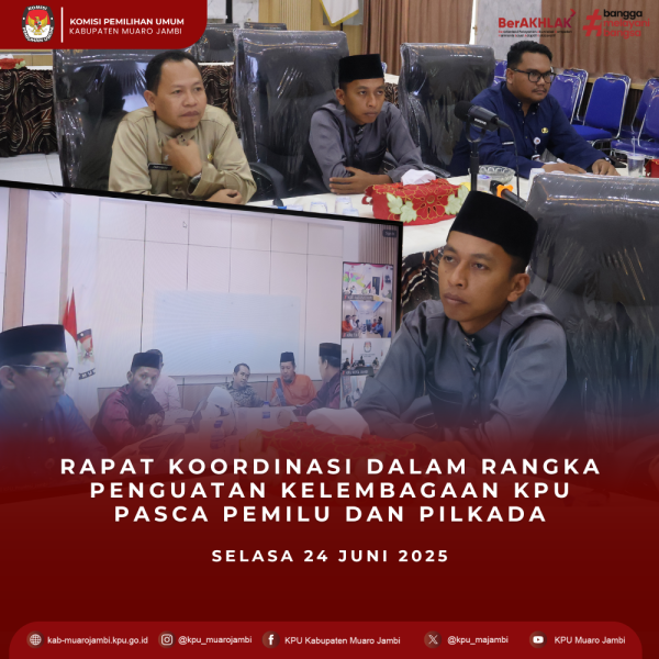 Halo #TemanPemilih, Komisi Pemilihan Umum Kabupaten Muaro Jambi mengikuti zoom meeting Rapat Koordinasi dalam rangka Penguatan Kelembagaan KPU Pasca Pemilu dan Pilkada. Selasa, 24 Juni 2025. Agenda kegiatan ini membahas mengenai koordinasi lanjutan Rakornas Divisi Teknis Penyelenggaraan Pemilu pada KPU Provinsi Jambi serta KPU Kabupaten/Kota se-Provinsi Jambi. #kpumelayani #humaskpumuarojambi