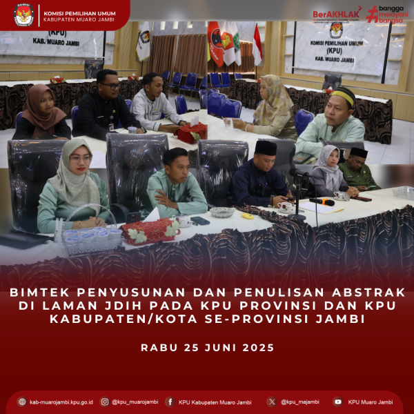 Halo #Temanpemilih, KPU Kabupaten Muaro Jambi mengikuti kegiatan zoom meeting Bimtek bersama KPU Provinsi Jambi serta KPU Kabupaten/Kota se-Provinsi Jambi. Rabu, 25 Juni 2025. Agenda Bimtek ini diselenggarakan dalam rangka peningkatan kapasitas tentang penyusunan dan penulisan Abstrak di laman JDIH pada KPU Provinsi dan KPU Kabupaten/Kota se-Provinsi Jambi. ‎#kpumelayani ‎#humaskpumuarojambi