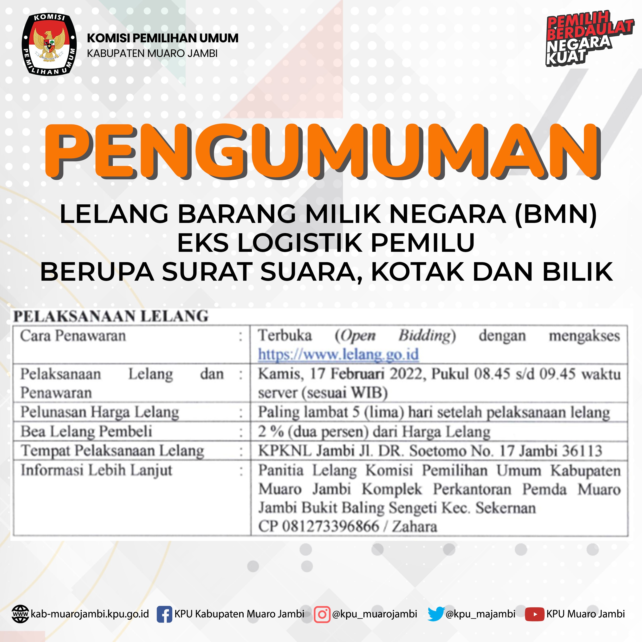 Dengan ini kami sampaikan daftar barang yang telah mendapat persetujuan Arsip Nasional Republik Indonesia (ANRI) dan Komisi Pemilihan Umum Republik Indonesia (KPU RI) untuk dapat dilakukan penghapusan/pemusnahan berupa 1 (Satu) Paket BMN Eks Logistik Pemilu/Pemilihan yaitu Surat Suara, Kotak Suara, Bilik Suara (Berbahan Kardus), dan Bilik Suara Aluminium. dengan penjualan melalui KPKNL Jambi Pengumuman Lelang Atas Obyek Lelang Pengumuman selengkapnya dapat diunduh melalui link berikut ini :