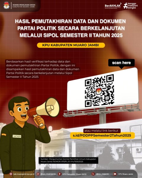 Pengumuman ini dituangkan dalam Pengumuman KPU Kabupaten Muaro Jambi Nomor: 975/PL.01.1-Pu/1505/2025 dan diharapkan dapat menjadi bahan informasi bagi Partai Politik serta masyarakat luas.