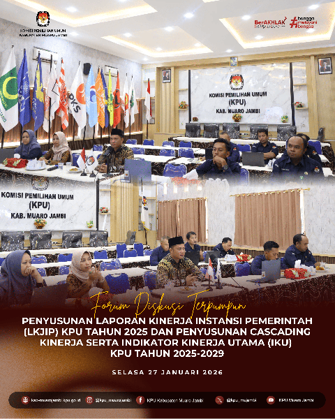Muaro Jambi – Komisi Pemilihan Umum (KPU) Kabupaten Muaro Jambi mengikuti Forum Diskusi Terpumpun (FDT) Penyusunan Laporan Kinerja Instansi Pemerintah (LKjIP) KPU Tahun 2025 serta perumusan Cascading Kinerja dan Indikator Kinerja Utama (IKU) KPU, KPU Provinsi, dan KPU Kabupaten/Kota untuk periode 2025–2029 pada Selasa, 27 Januari 2026.