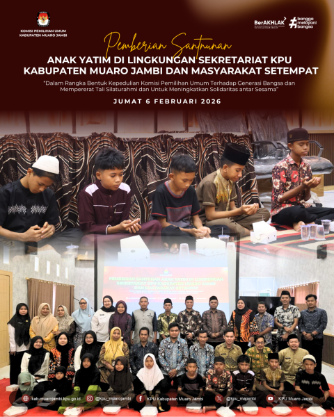 Muaro Jambi - KPU Kabupaten Muaro Jambi melaksanakan kegiatan bertajuk “Pemberian Santunan Anak Yatim di Lingkungan Sekretariat KPU Kabupaten Muaro Jambi dan Masyarakat Setempat” pada Jumat, 6 Februari 2026. Kegiatan tersebut berlangsung di Aula KPU Kabupaten Muaro Jambi dengan penuh khidmat dan suasana kekeluargaan.