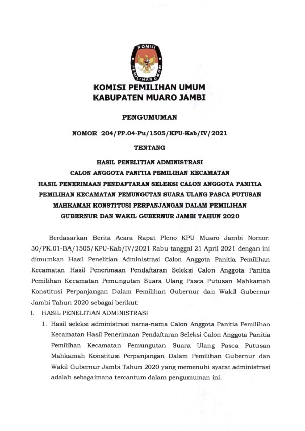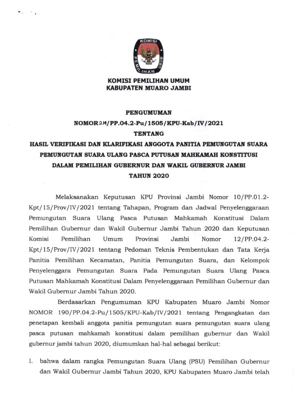 PENGUMUMAN HASIL VERIFIKASI DAN KLARIFIKASI ANGGOTA PANITIA PEMUNGUTAN SUARA PEMUNGUTAN SUARA ULANG (PSU) PASCA PUTUSAN MAHKAMAH KONSTITUSI TAHUN 2020