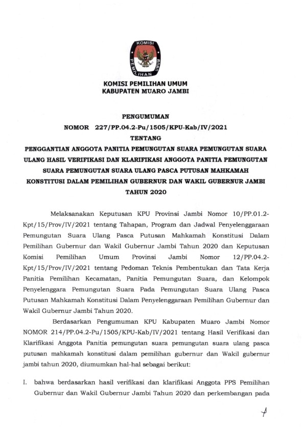 PENGUMUMAN PENGGANTIAN ANGGOTA PANITIA PEMUNGUTAN SUARA PEMUNGUTAN SUARA ULANG (PSU) HASIL VERIFIKASI DAN KLARIFIKASI PASCA PUTUSAN MAHKAMAH KONSTITUSI TAHUN 2020