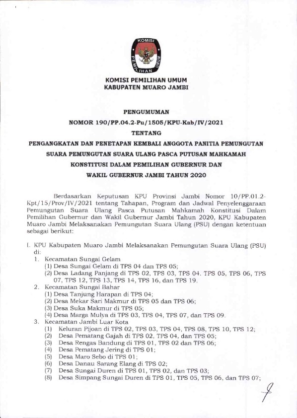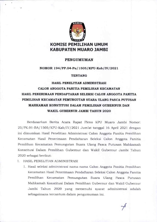 PENGUMUMAN HASIL PENELITIAN ADMINISTRASI CALON ANGGOTA PPK PASCA PUTUSAN MAHKAMAH KONSTITUSI TAHUN 2020
