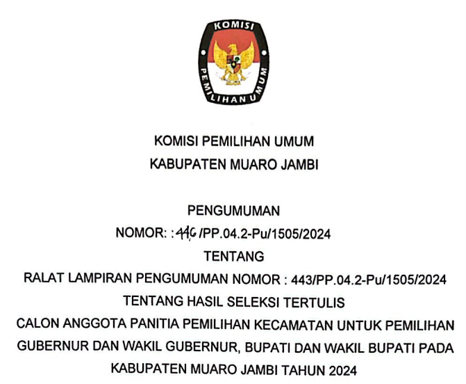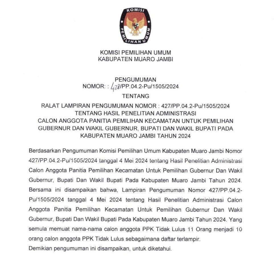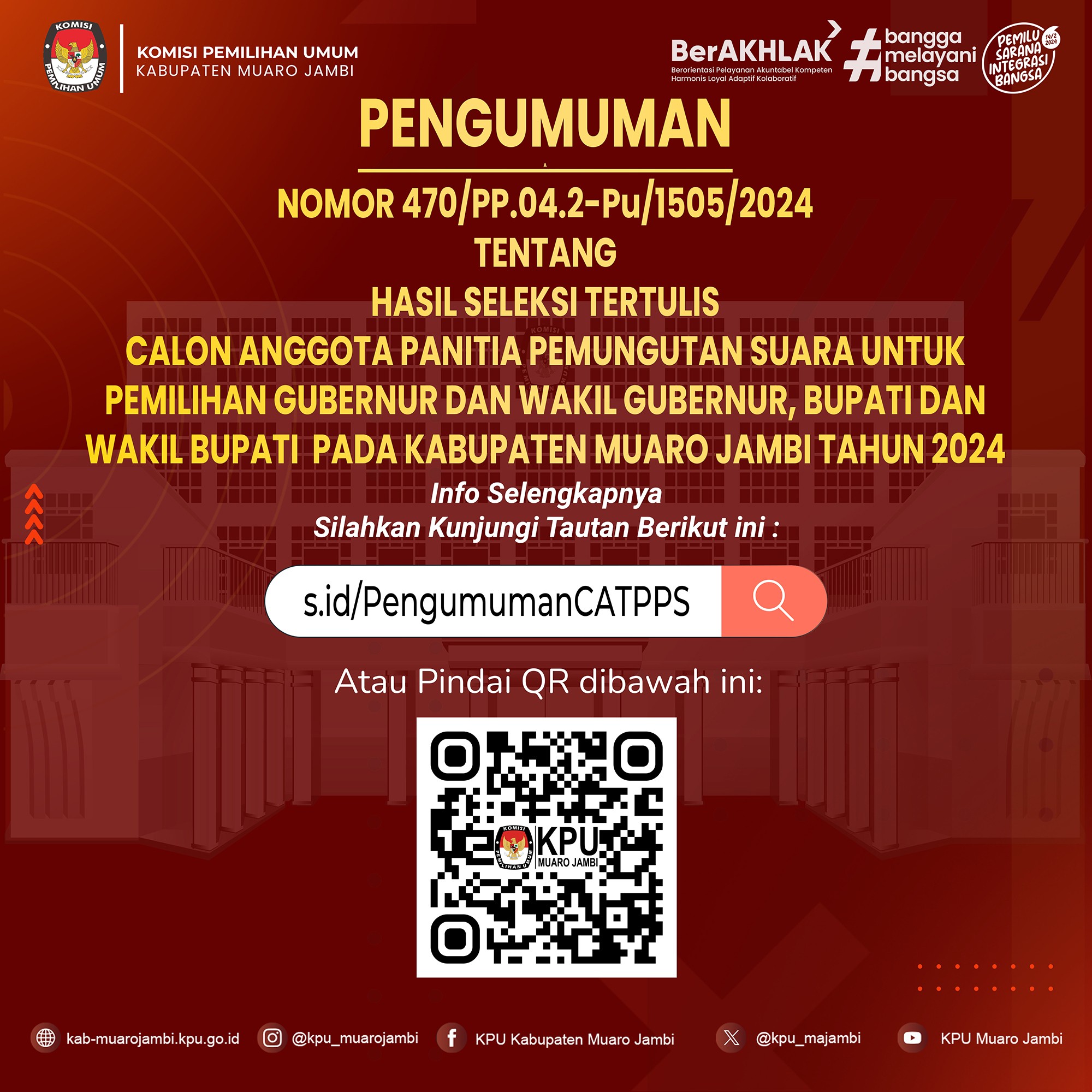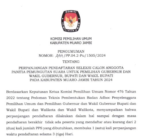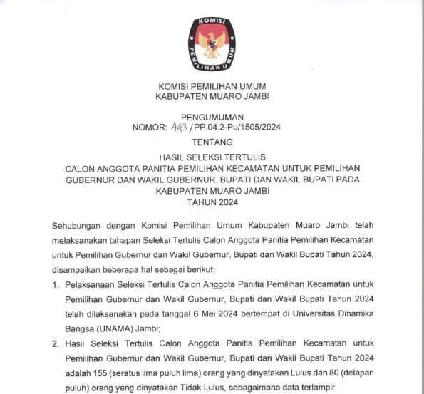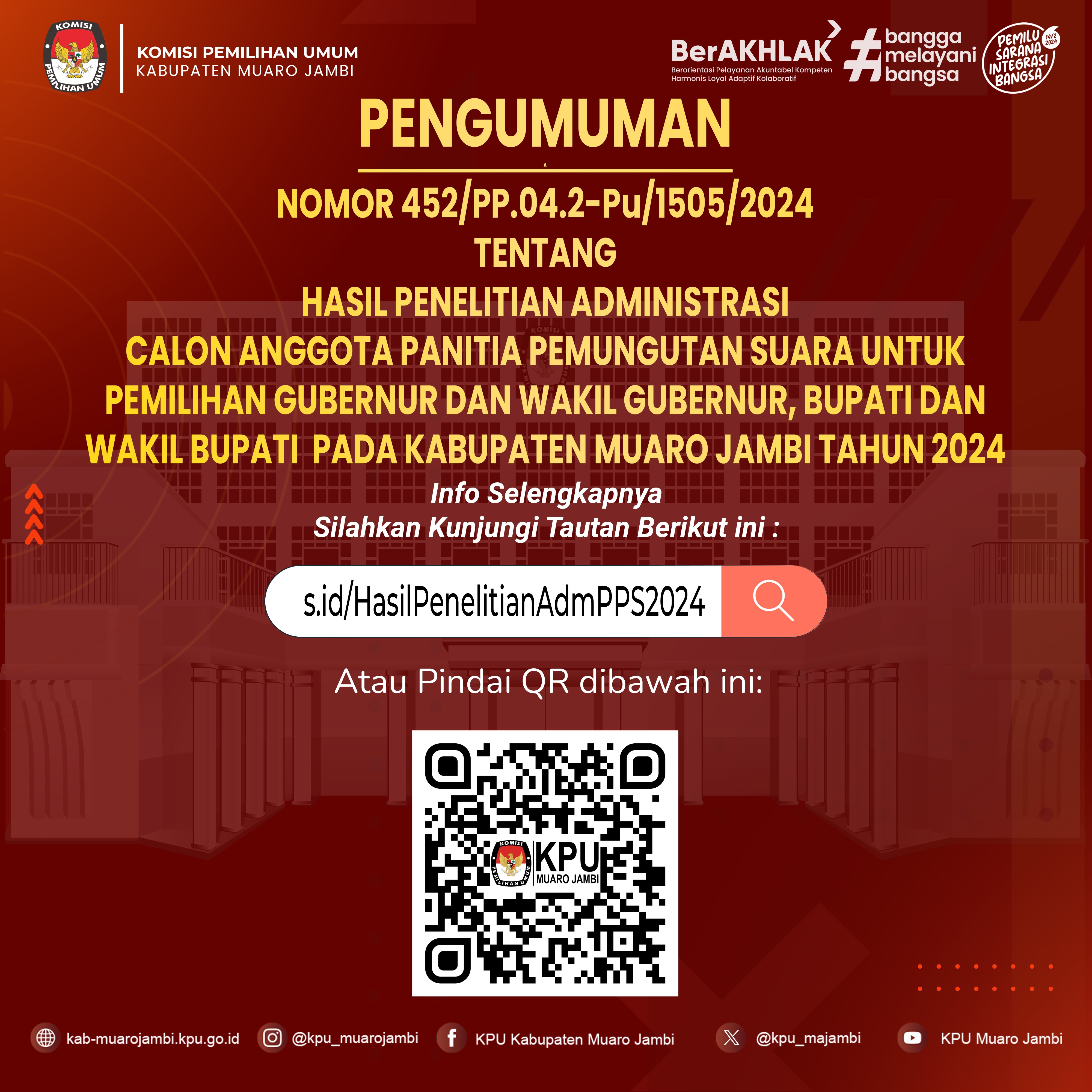Sehubungan dengan Komisi Pemilihan Umum Kabupaten Muaro Jambi telah melaksanakan tahapan Penelitian Administrasi Calon Anggota Panitia Pemungutan Suara pada untuk Pemilihan Gubernur dan Wakil Gubernur, Bupati dan Wakil Bupati Tahun 2024, disampaikan beberapa hal sebagai berikut: Pelaksanaan Pendaftaran dan Penelitian Administrasi Calon Anggota Panitia Pemungutan Suara untuk Pemilihan Gubernur dan Wakil Gubernur, Bupati dan Wakil Bupati Tahun 2024 telah dilaksanakan pada tanggal 3 Mei sampai dengan tanggal 12 Mei 2024 bertempat di Kantor Komisi Pemilihan Umum Kabupaten Muaro Jambi Hasil Penelitian Administrasi Calon Anggota Panitia Pemungutan Suara untuk Pemilihan Gubernur dan Wakil Gubernur, Bupati dan Wakil Bupati adalah 1.118 (Seribu seratus delapan belas) orang yang dinyatakan Memenuhi Syarat dan 14 (empat belas) orang yang dinyatakan Tidak Memenuhi Syarat, sebagaimana data terlampir. Untuk info Lebih Lanjut, silahkan unduh pada tautan berikut: Pengumuman Hasil Penelitian Administrasi